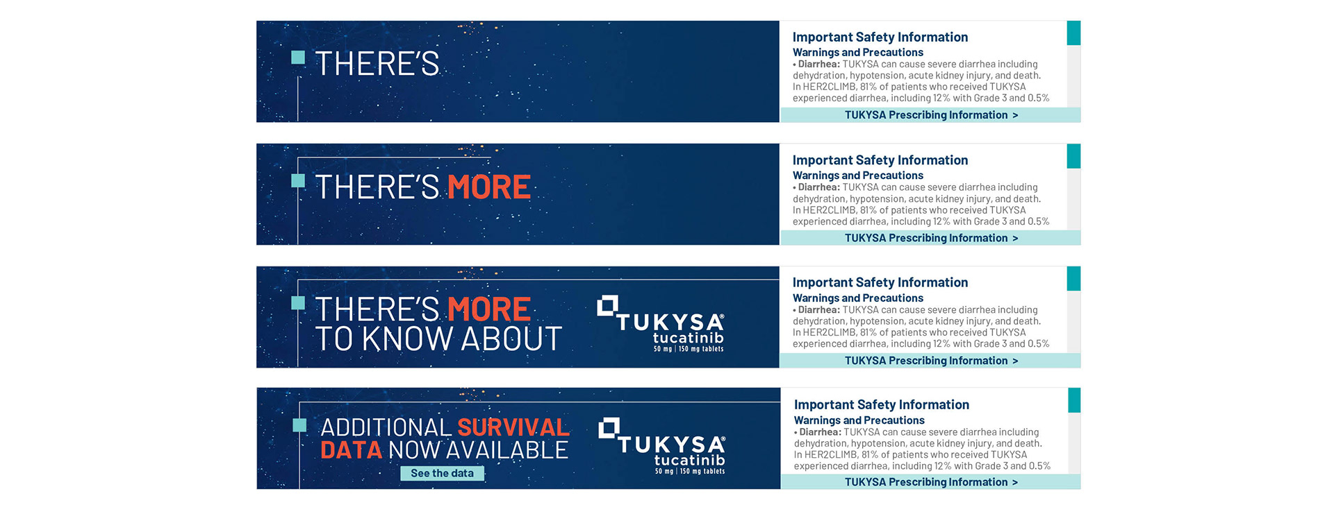 Seagen (formerly Seattle Genetics) is a biotechnology company focused on developing innovative therapies for the treatment of cancer. The company, headquartered in Bothell, Washington, is the industry leader in antibody-drug conjugates or ADCs, a technology designed to harness the targeting ability of monoclonal antibodies to deliver cell-killing agents directly to cancer cells. TUKYSA® is indicated for the treatment of adult patients with advanced metastatic HER2-positive breast cancer. While at Alexander Health, I designed print and digital pieces, including banner ads, brochures, and CVAs, for both clinical and consumer audiences.